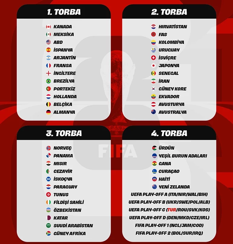 FIFA'dan yapılan açıklamada, kıtalararası play-off eşleşmelerinden iki ve Avrupa elemelerinden gelecek dört ülkenin 4. torbaya yerleştirileceği belirtildi.