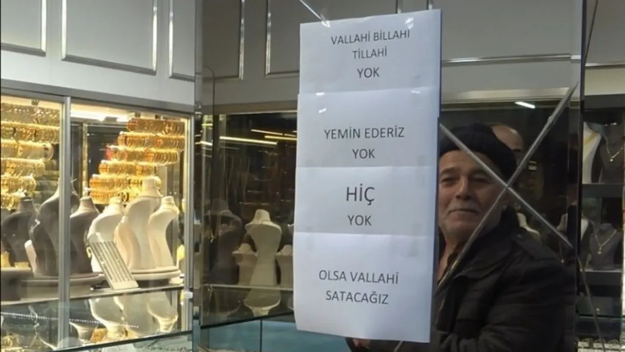 Bursa’da bir kuyumcu, artan talep karşısında stokların tükenmesi üzerine dükkanına dikkat çeken bir yazı astı.