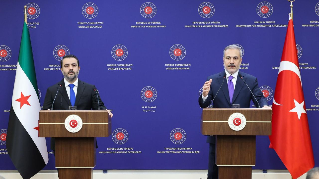 Dışişleri Bakanı Hakan Fidan, Suriye Geçiş Hükümeti'nin Dışişleri Bakanı Esad Hasan Şeybani ile düzenlediği ortak basın toplantısı için kameraların karşısına geçti.