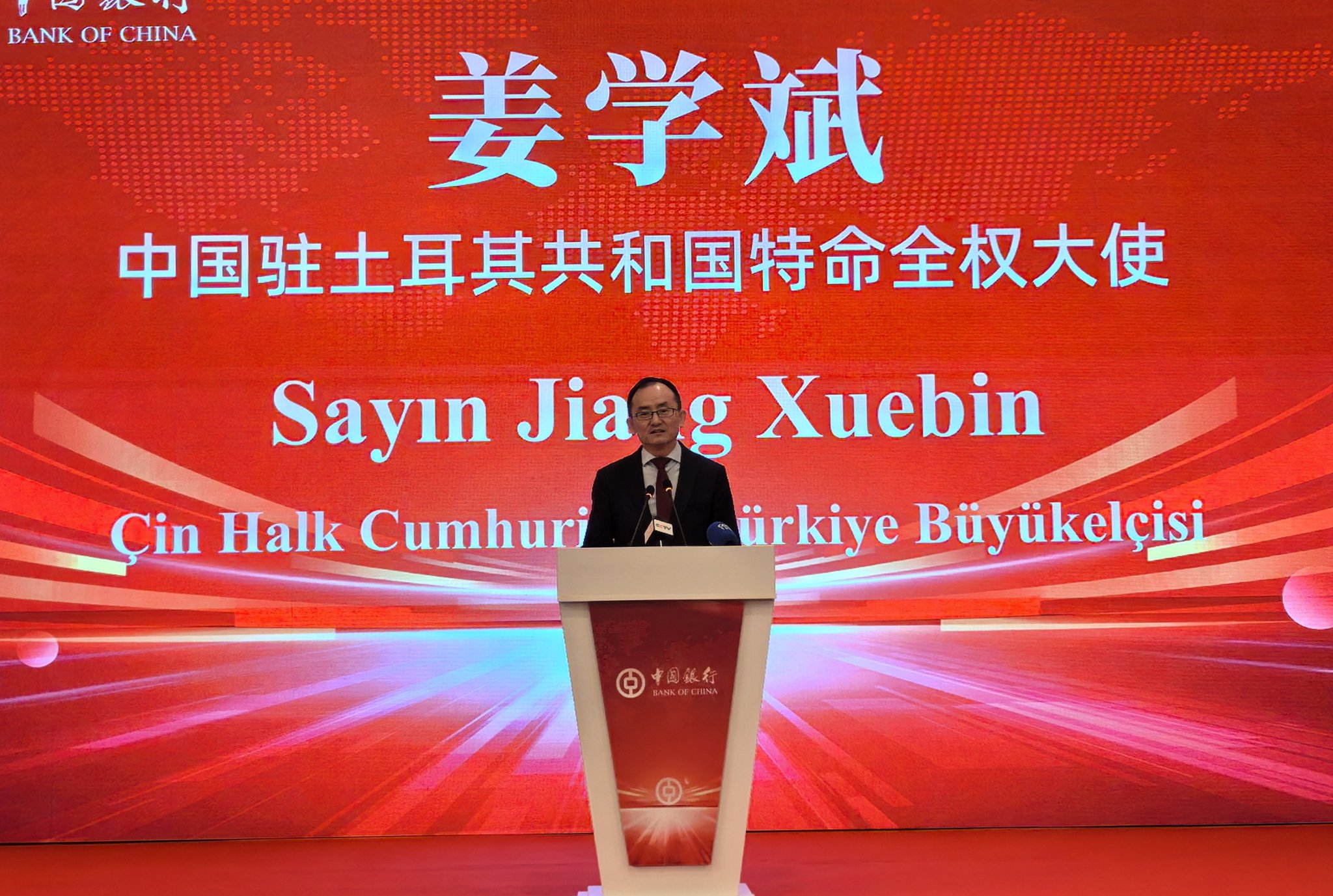 Konuşmasında Çin’in Türkiye’ye yaptığı doğrudan yatırımlara da değinen Jiang, “Bugün itibarıyla Çin’in Türkiye’ye yaptığı toplam doğrudan yatırım 3,23 milyar ABD dolarına ulaşmıştır. Çok sayıda Çinli şirket Türkiye’de yatırım yaparak faaliyet göstermeye başlamıştır. Bu şirketlerin büyüme sürecinde, Bank of China’nın Türkiye’deki kurumlarının sağladığı destek büyük rol oynamaktadır” dedi.