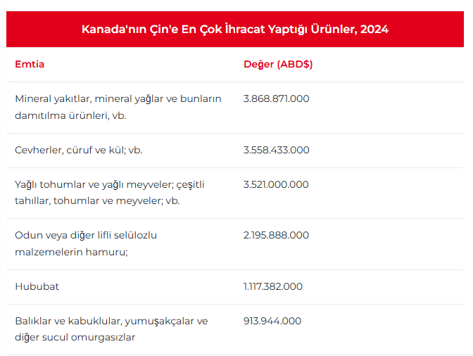 Kanada'nın Çin'e yaptığı mineral yakıt ihracatı son birkaç yılda büyük artış gösterdi; 2023'ten 2024'e yüzde 63'ün üzerinde artarak 3,9 milyar ABD dolarına ulaştı ve 2025'in yalnızca ilk dokuz ayında 4 milyar ABD dolarını aştı.