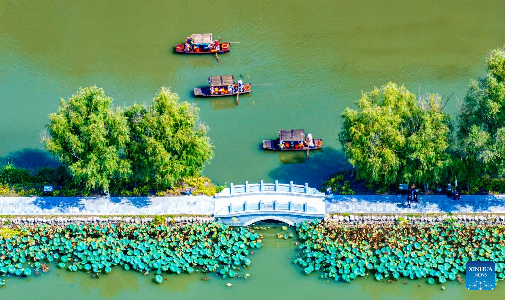 7 Ekim 2025’te çekilen bir drone fotoğrafı, Çin’in doğusundaki Jiangsu eyaletine bağlı Xinghua şehrinde yer alan Lixiahe Ulusal Sulak Alan Parkı’nda teknelere binen turistleri gösteriyor. Ulusal Gün ve Orta Sonbahar Festivali tatilinin sona ermesine rağmen, ülke genelinde tatil coşkusu hız kesmeden devam ediyor