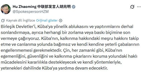 Çin Komünist Partisi Uluslararası İlişkiler Dairesi Sözcüsü Hu Zhaoming, sosyal medya platformu X üzerinden yaptığı açıklamada, ABD’yi Küba’ya yönelik tüm zorlayıcı tedbirleri derhal kaldırmaya çağırdı.