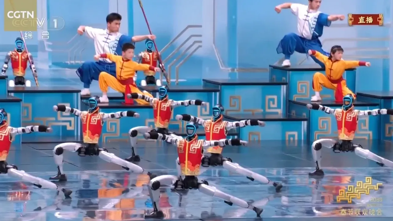 Çinli robotik şirketi Unitree tarafından geliştirilen "H2" model insansı robotlar, Hınan eyaletindeki Tagou dövüş sanatları okulundan öğrencilerle sahnede hünerlerini sergiledi.