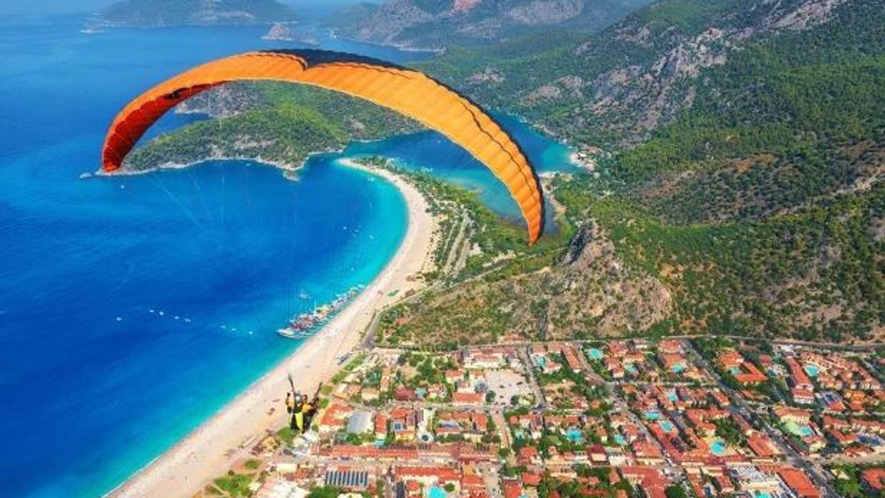 Yamaç paraşütü pilotu Mustafa Gökhan Toygar, Ölüdeniz Mahallesi'ndeki Babadağ'ın 1700 metrelik pistinden Polonya uyruklu yolcusu Mark Daniel ile uçuş yaptı.