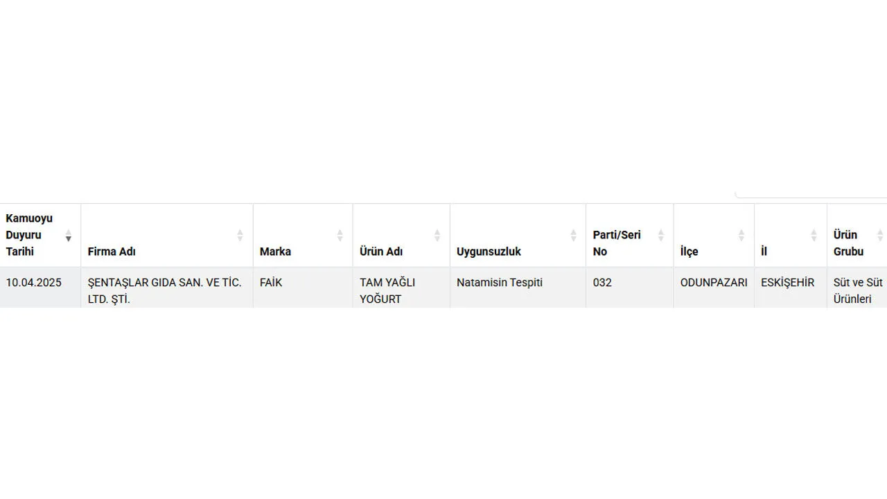 'Faik' adlı markanın tam yağlı yoğurdunda 'natamisin' tespit edildi.