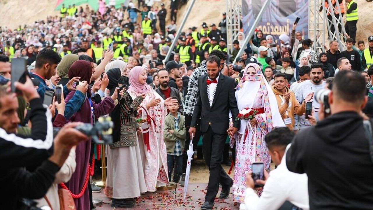 İsrail saldırıları altında geçen zorlu süreçte çoğunluğu yerinden edilen Filistinlilerden oluşan gençler, hayırseverlerin destekleriyle evlendi.