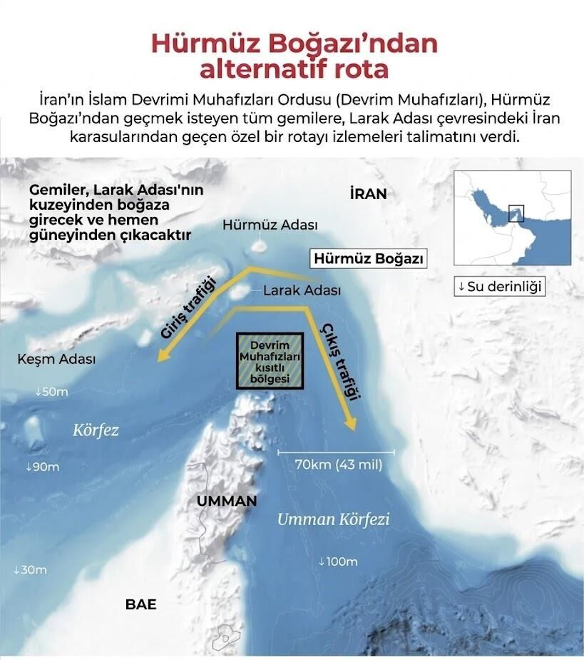IRGC, ana geçiş hattında deniz mayını riski bulunduğunu belirterek eski rotayı “yasaklı bölge” ilan etti. Gemilere, yeni talimat kapsamında Larak Adası’nın kuzeyinden giriş yapıp güneyinden çıkmaları söylendi.