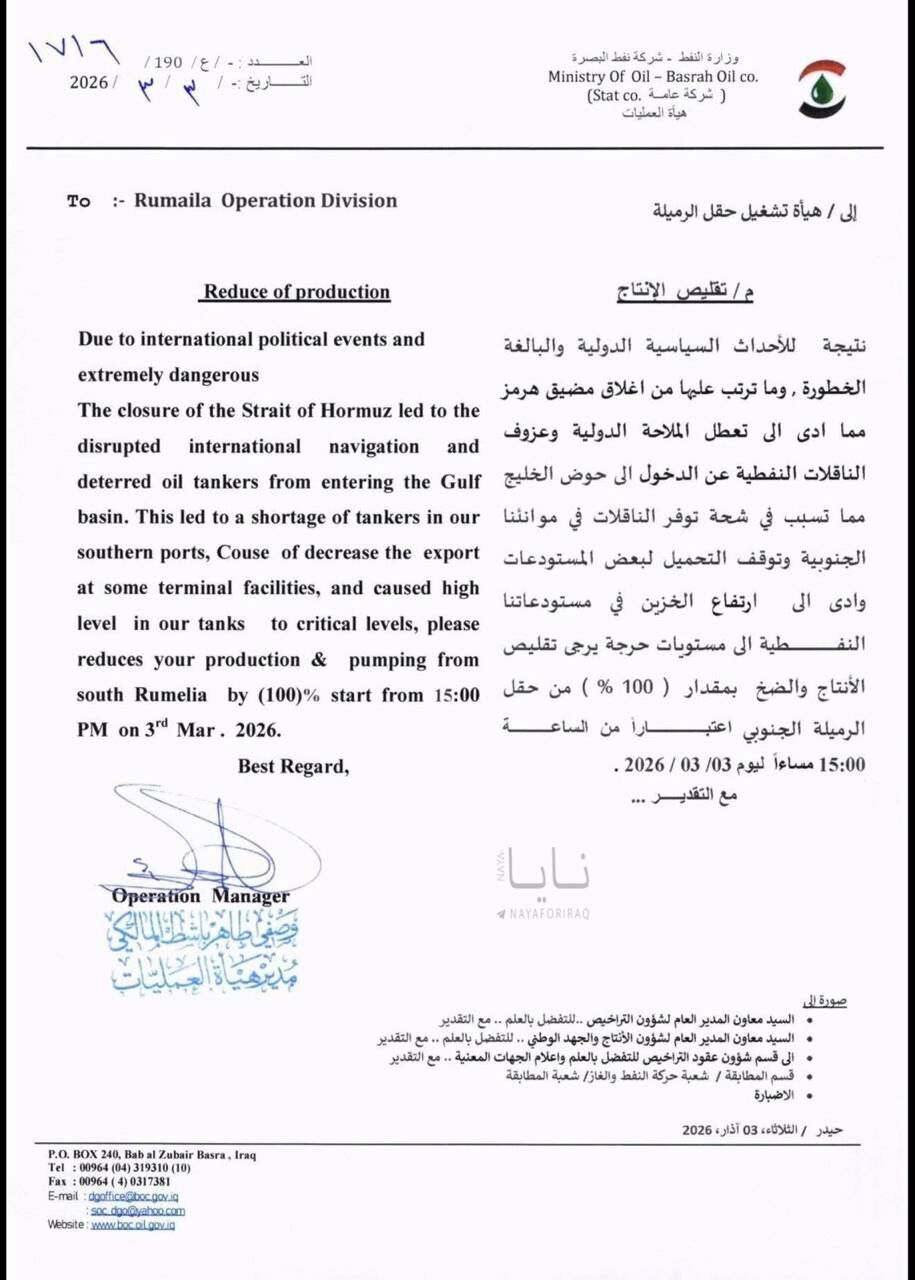 3 Mart 2026 tarihli resmi yazıda, saat 15.00 itibarıyla Güney Rumaila sahasında üretim ve pompalamanın durdurulmasına karar verildi.