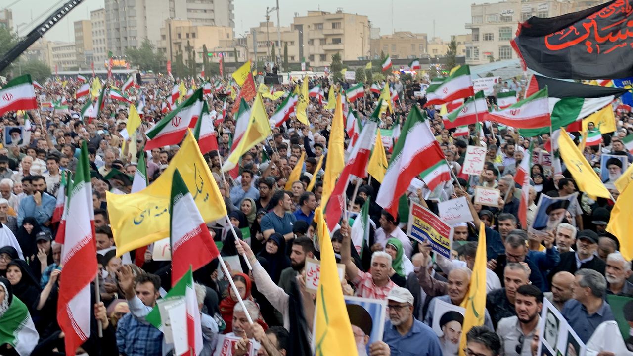 ABD'nin tehdit ettiği İran lideri Ayetullah Ali Hamaney'in posterlerini taşıyan İranlılar, sık sık "zillet bizden uzaktır", "Amerika'ya ölüm", "İsrail'e ölüm", "taviz yok" sloganları attı.