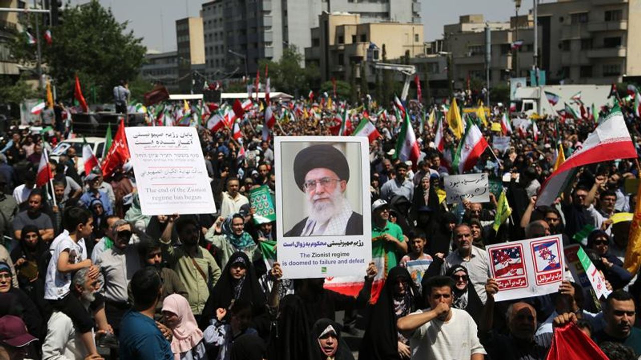 İnkılap Meydanı'nda toplumun birçok kesiminden İranlının katıldığı gösterilerde kalabalık gruplar, ellerinde İran bayraklarıyla ABD ve İsrail'e öfkelerini dile getirdi.