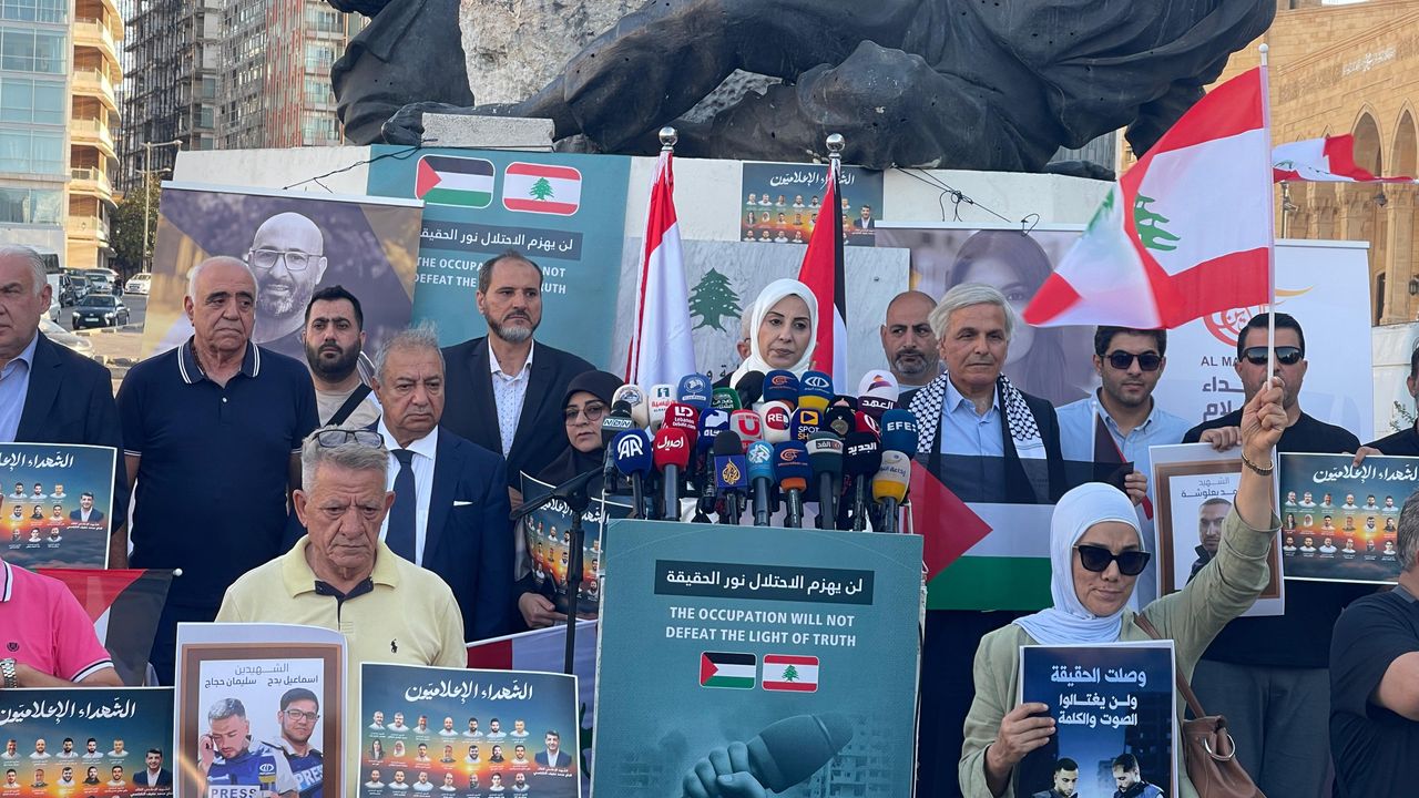 Göstericiler, Filistin ve Lübnan bayraklarının yanı sıra İsrail saldırılarında hayatını kaybeden gazetecilerin fotoğrafları ve üzerinde "İsrail gazetecileri öldürüyor", "Hakikat, gazetecilerin kanı ve özgürlüğün mürekkebiyle yazılır" yazılı dövizler taşıdı.