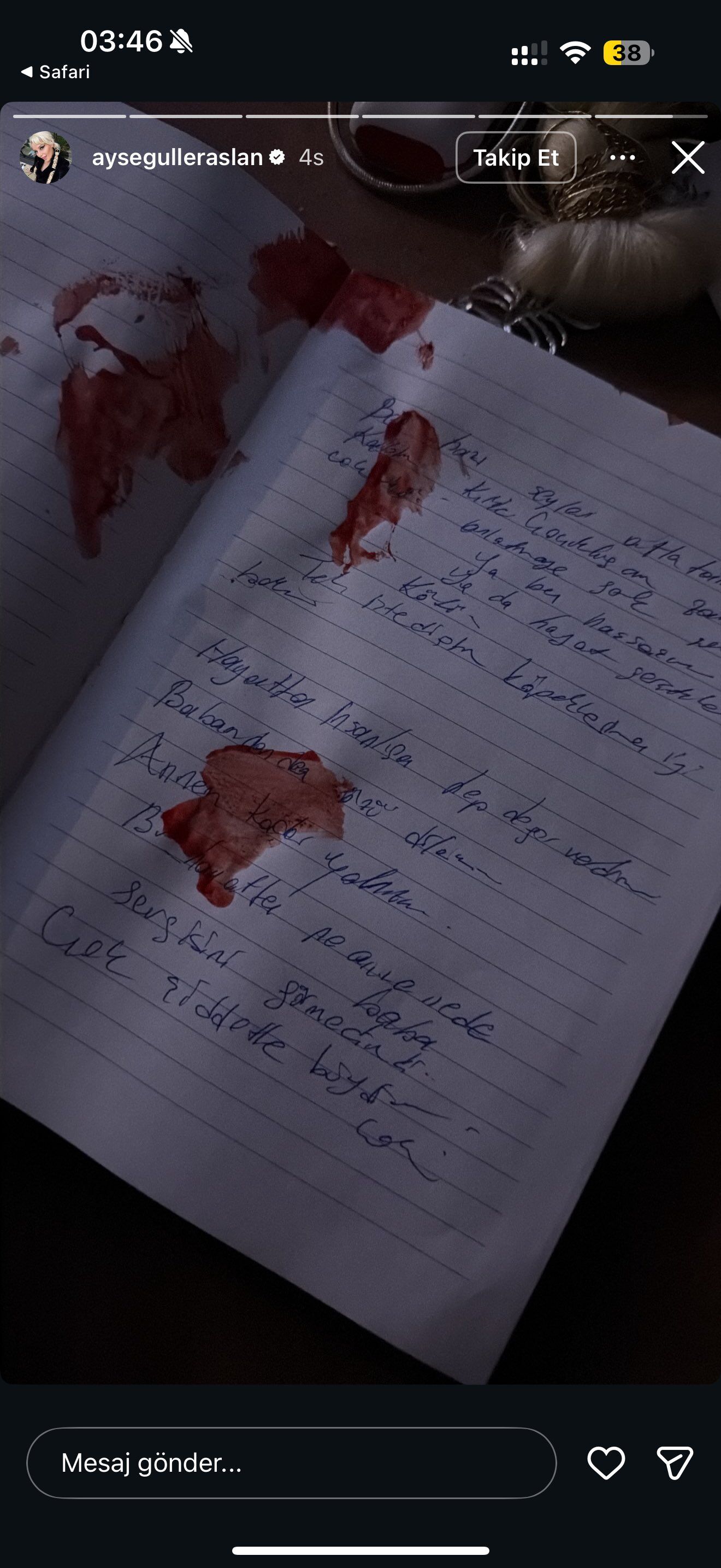 Olayın ardından Ayşegül Eraslan'ın sosyal medya hesabından yaptığı son paylaşımlar mercek altına alındı. Özellikle Instagram hikayesinde paylaştığı bir mesaj ve kanlı bir not fotoğrafı, takipçileri arasında büyük endişe ve üzüntüye neden oldu.