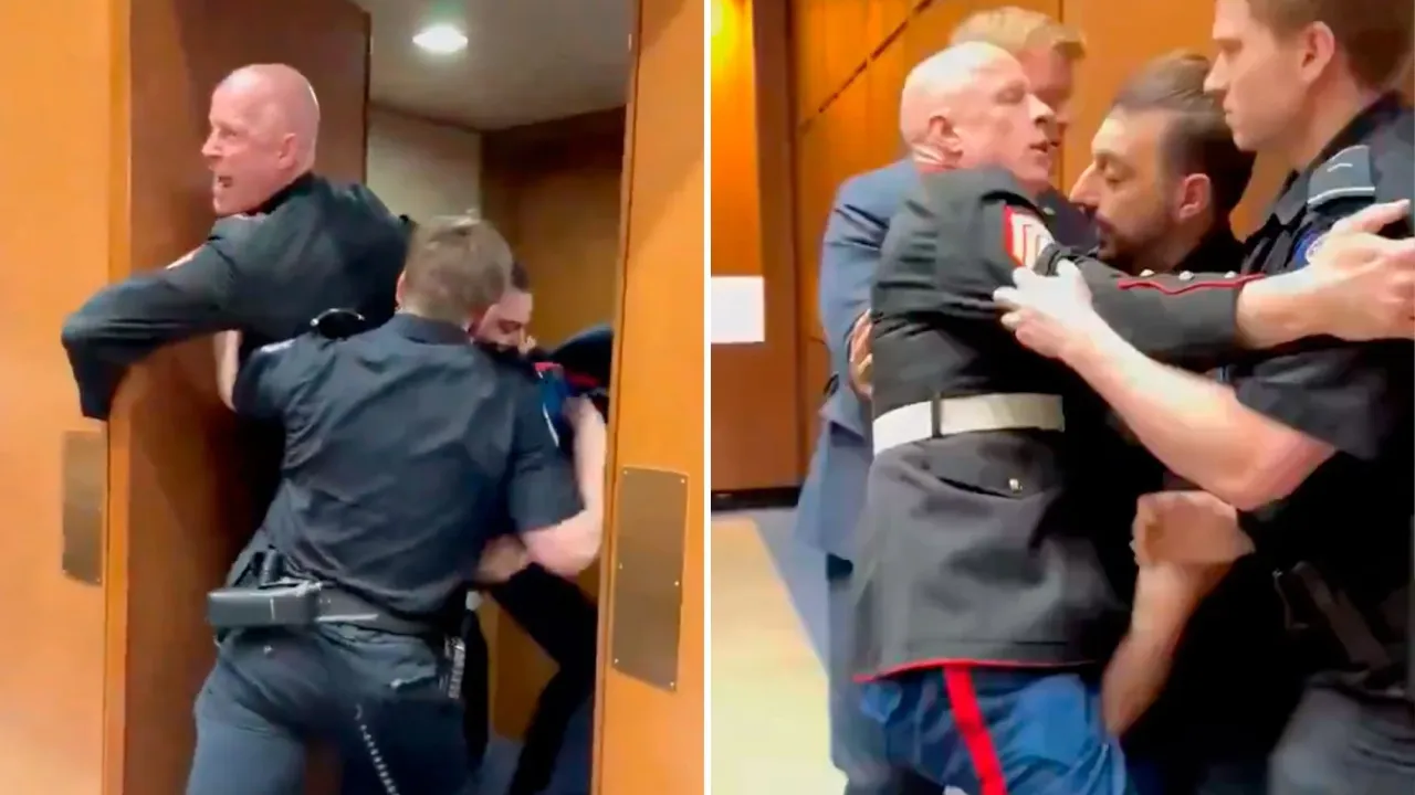 Ardından, "Filistin özgür kalacak." ifadelerini kullanan McGuinness, Kongrenin güvenliğinden sorumlu iki polis tarafından zorla salondan çıkarılmaya çalışıldı.