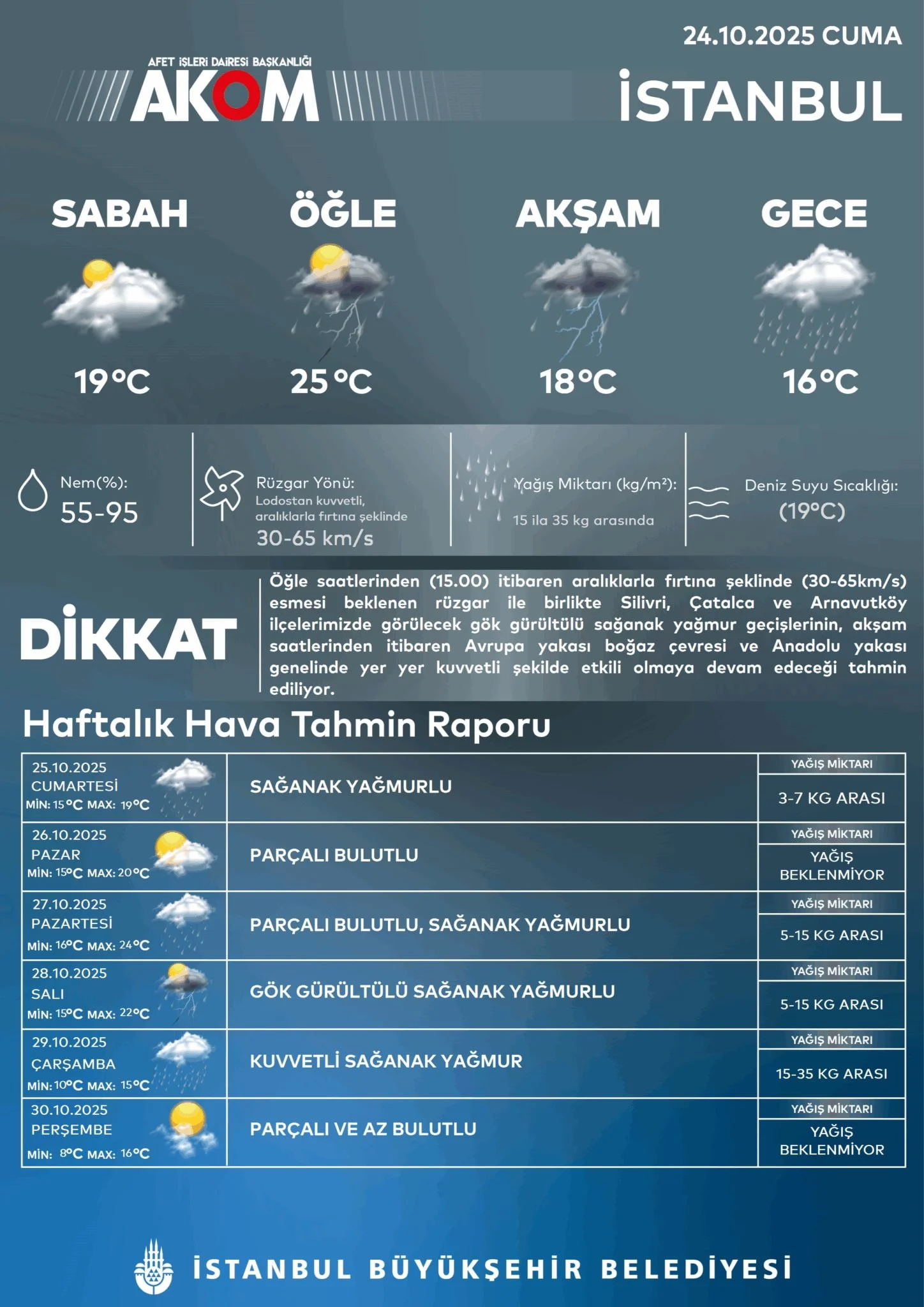 "Bugün 15:00 den sonra Trakya'dan başlayacak yağış akşam saatlerinden itibaren İstanbul ve zamanla Kocaeli, Sakarya, Düzce, Zonguldak ve Bartın çevrelerinde yer yer kuvvetli. ani sel, su baskını, yıldırım, yerel küçük çaplı dolu ve yağış anında kuvvetli rüzgar yaşamda olumsuzluklar yapabilir. dikkatli ve tedbirli olunmalı."