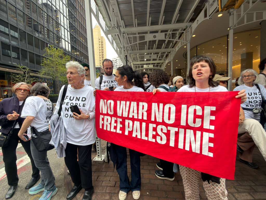 Eylemciler, “İsrail’i silahlandırmayı durdurun” ve “Savaşa hayır, ICE’a hayır, özgür Filistin” yazılı pankartlar taşıyarak ABD yönetiminin İsrail’e yönelik askeri desteğini protesto etti.