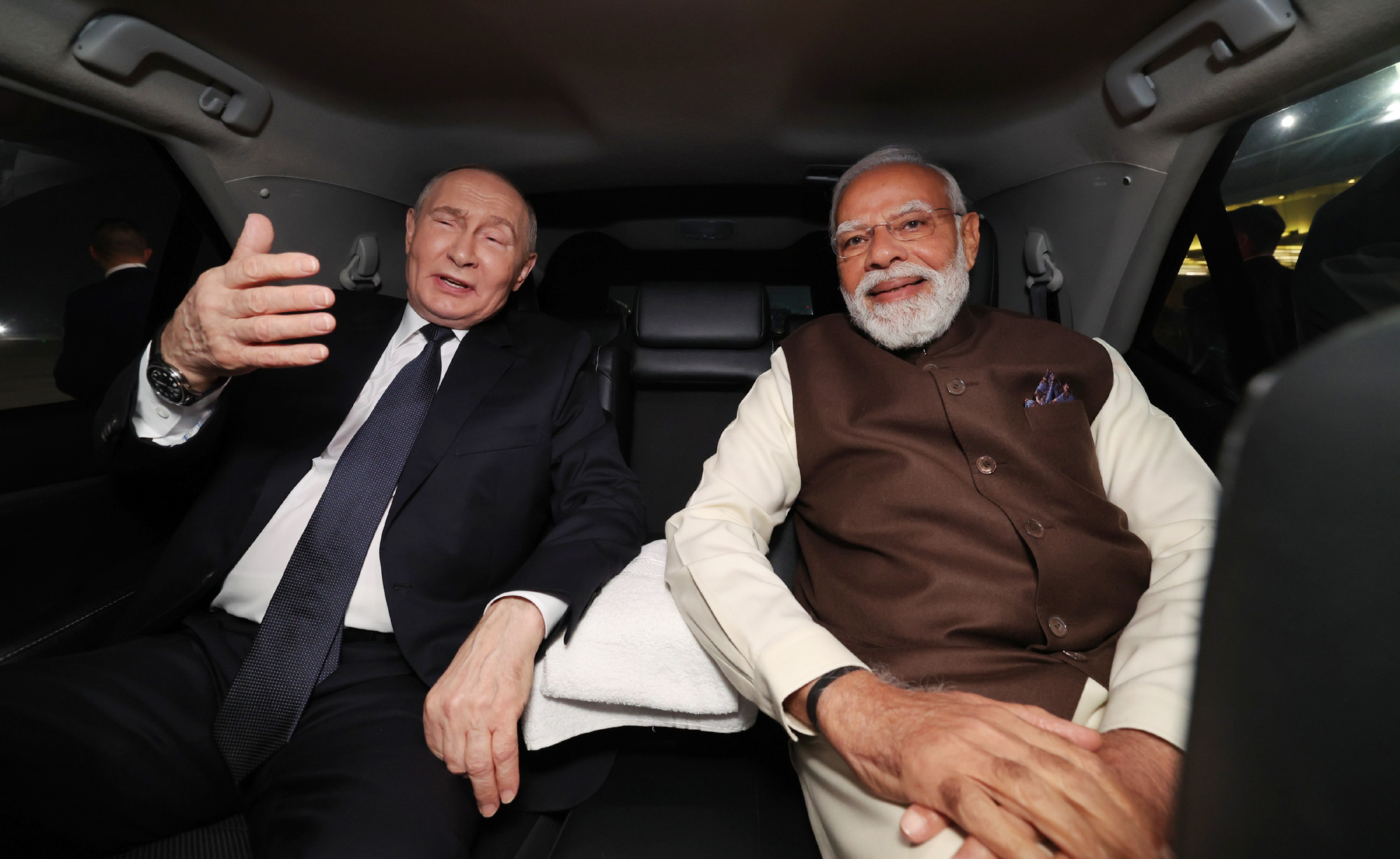 Putin, Yeni Delhi'deki Cumhurbaşkanlığı Sarayı'nın bulunduğu meydanda, Hindistan Cumhurbaşkanı Draupadi Murmu ve Başbakan Modi tarafından resmi törenle karşılandı. Törenin ardından Haydarabad Sarayı'nda, Putin ile Modi arasındaki görüşme başladı. Görüşmenin basına açık kısmında konuşan Modi, Putin'i Hindistan'da ağırlamaktan memnuniyet duyduğunu dile getirdi.