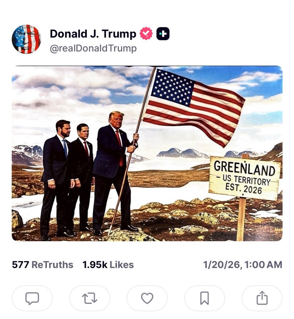Üzerinde "Grönland. ABD toprakları. 2026'da kuruldu" şeklinde tabelanın olduğu bir toprak parçasının bulunduğu görselde, Trump'ın, elinde bir ABD bayrağı ile ayakta durduğu görülüyor.