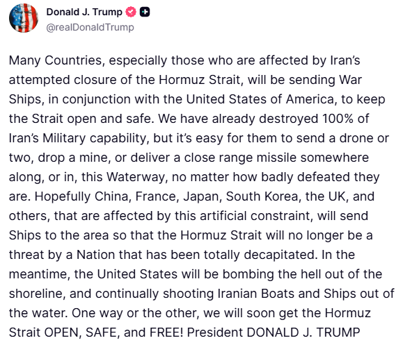 Trump, "Umarız Çin, Fransa, Japonya, Güney Kore, Birleşik Krallık ve bu yapay kısıtlamadan etkilenen diğer ülkeler bölgeye gemi gönderir. Böylece Hürmüz Boğazı, askeri gücü tamamen felce uğratılmış bir ulus (İran) tarafından artık bir tehdit unsuru olmaktan çıkar." değerlendirmesinde bulundu.